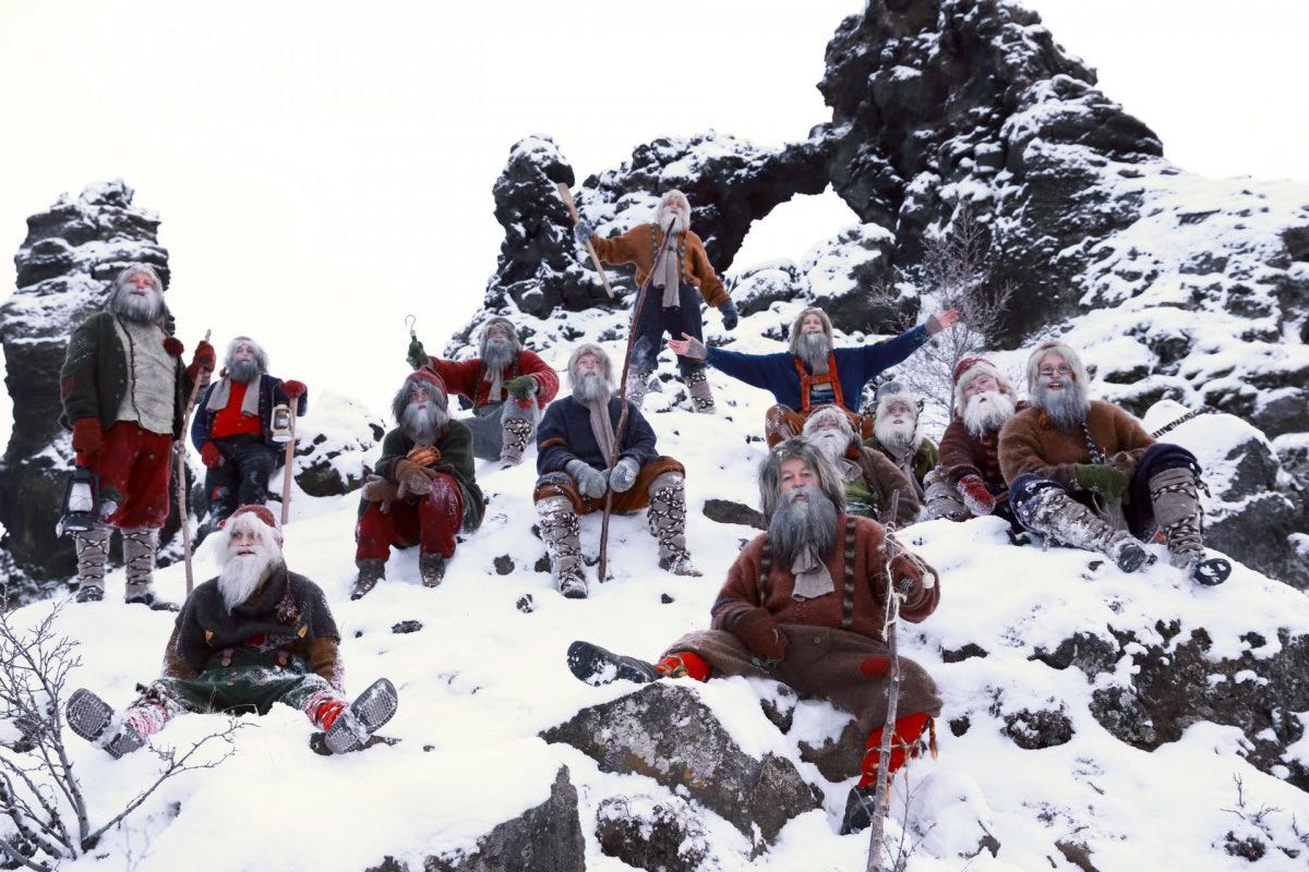 The 13 Yule lads are are funny little creatures that could be referred to as trolls. They are the sons of Grýla and Leppalúði. From their earliest age, Icelandic children are told the story of Grýla, the troll-lady that lives way up in the Icelandic mountains. According to folklore, Grýla has been married three times. Her third husband, Leppalúði, is said to be living with their thirteen children and a black cat, the Yule Cat, in a cave at Dimmuborgir lava field. Right before Yule, Grýla, the mother of 13 precocious boys (the Yule Lads), comes to town with her sons: Grýla in search of naughty children to boil in her cauldron, and the boys in search of mischief.